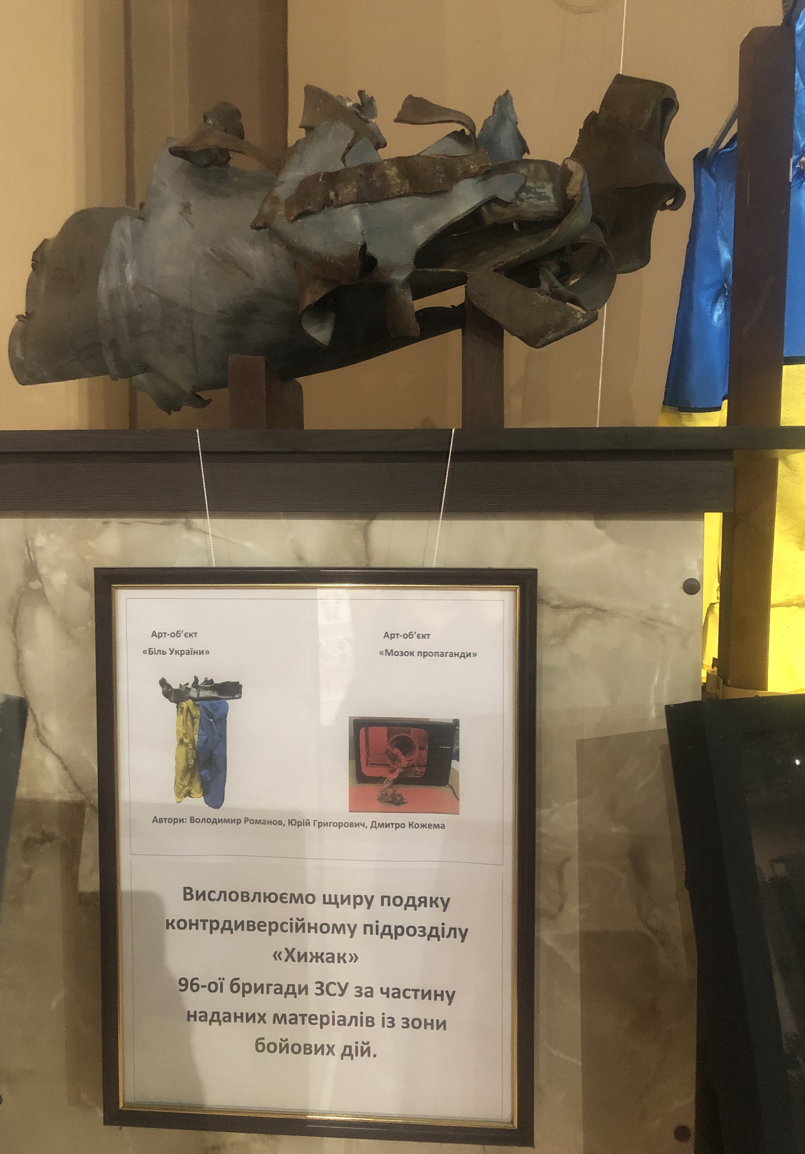 Представлені експонати з’явились у музеї в результаті реалізованих в часі повномасштабної війни мистецьких проєктів. Наш жовто-блакитний прапор із численними ушкодженнями його полотнища, а також покручений фрагмент смертоносного залізяччя були привезеними до Івано-Франківська з Маріуполя для презентації в Музеї мистецтв Прикарпаття виставки «Нескорений Маріуполь», що була відкрита у липні 2022 року, а по завершенні помандрувала країнами Європи.
