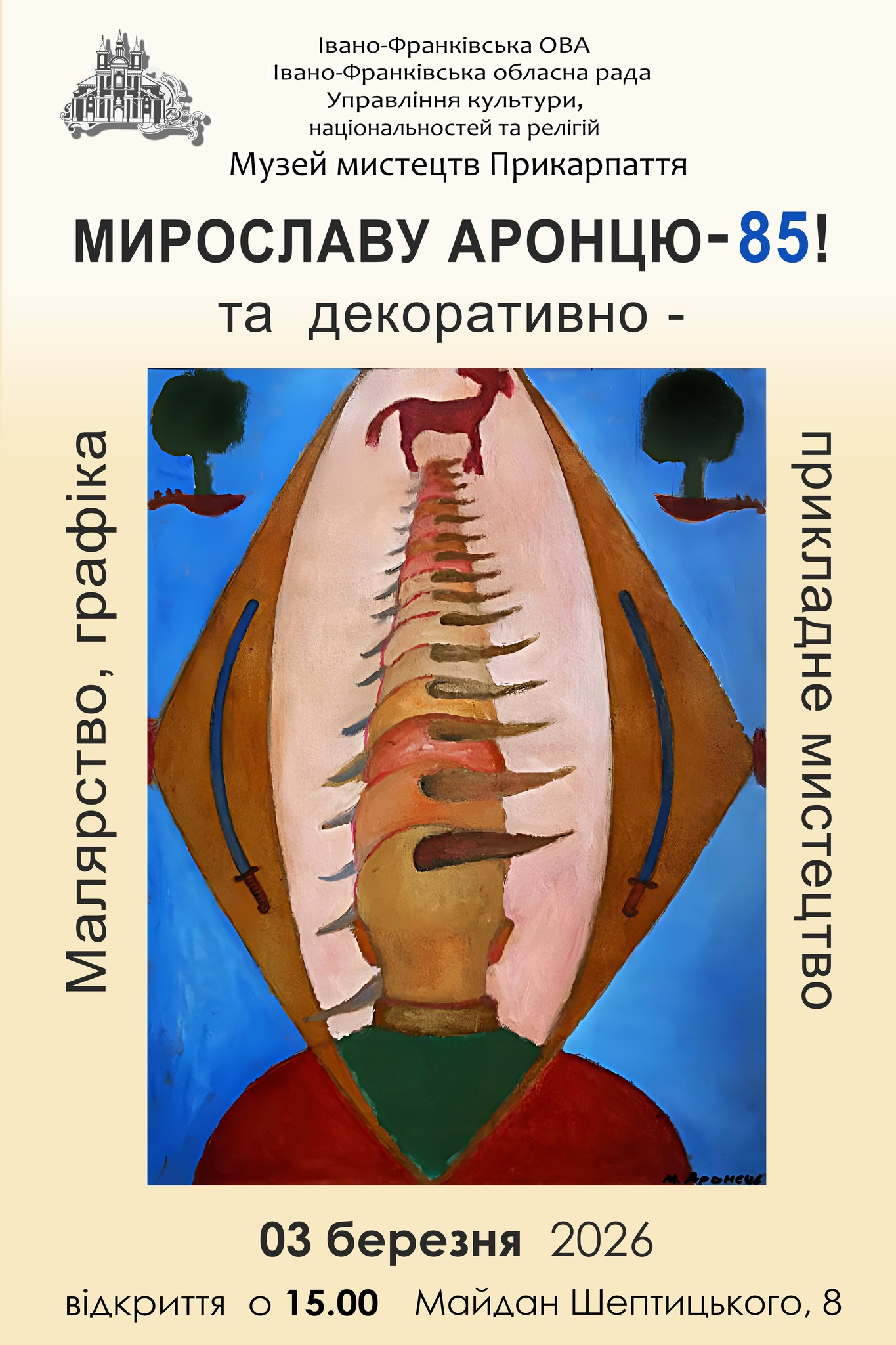 З нагоди поважної дати в житті нашого колеги, багаторічного співробітника Музею мистецтв Прикарпаття, художника, мистецтвознавця, поета та прозаїка, члена Національної спілки письменників України (1984 р.), лауреата обласної премії імені Василя Стефаника (2003 р.) Мирослава Аронця, музей пропонує для перегляду персональну виставку його багатого та розмаїтого творчого доробку.