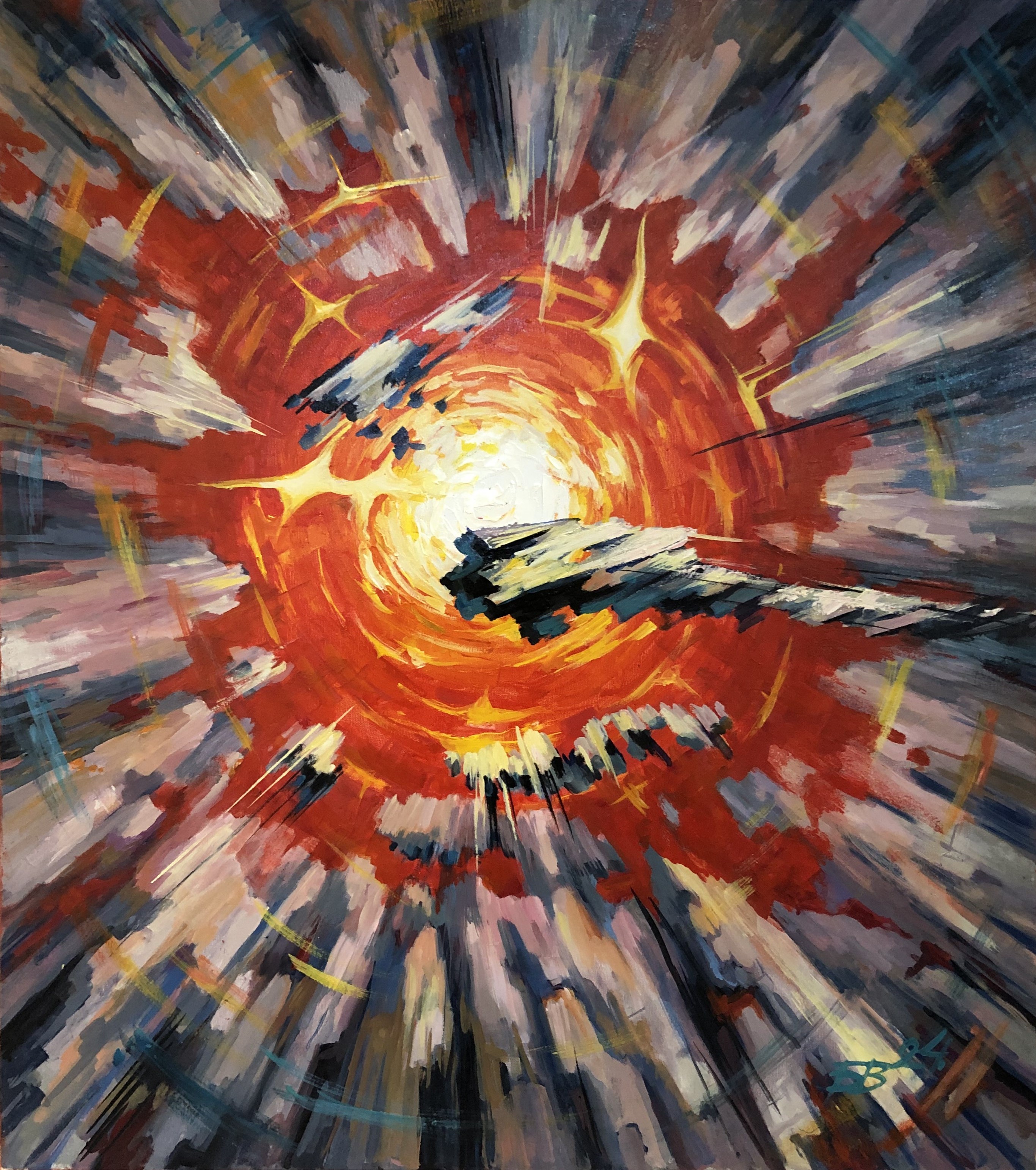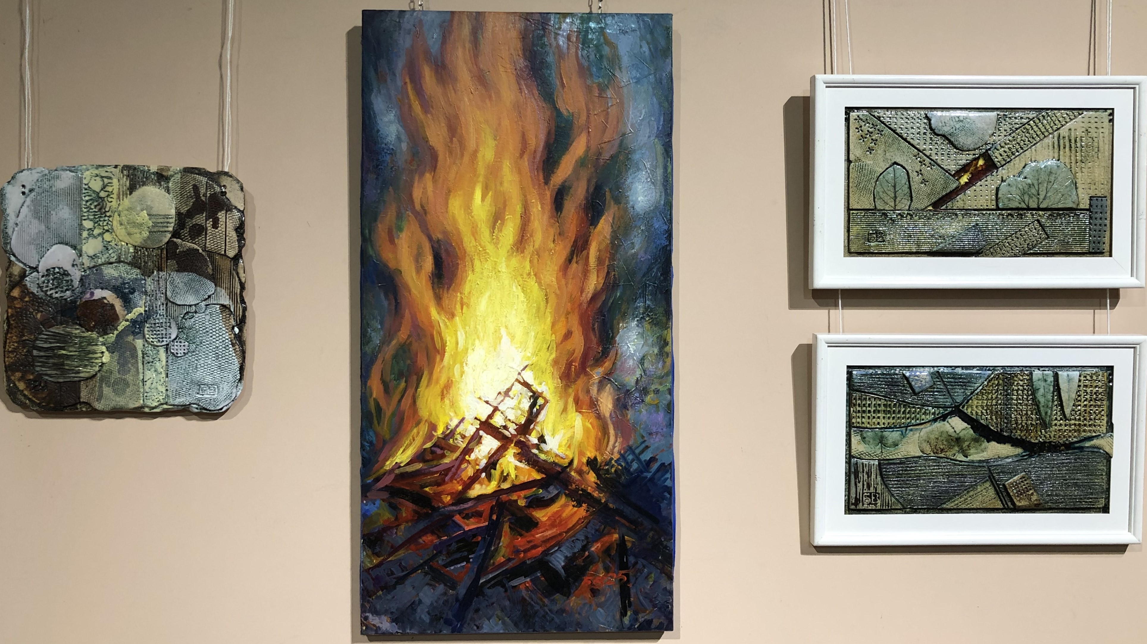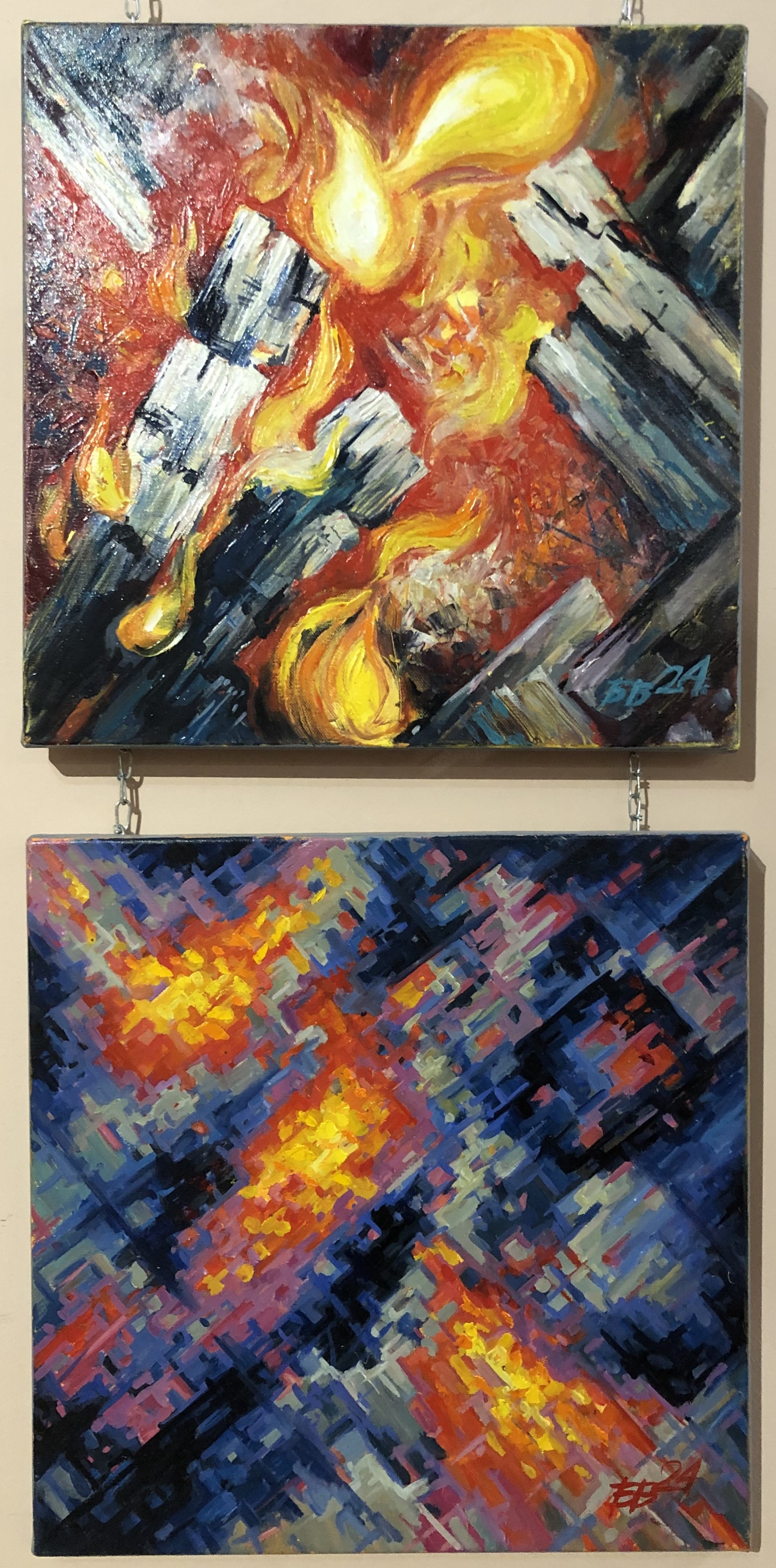 Вогонь – неодмінна складова виготовлення кераміки, він робить її твердою та дзвінкою. У мирний час вогонь, зазвичай, асоціюється з теплом, романтичними настроями. В умовах війни він здатний викликати цілком інші враження – нагадувати про спалені міста і села, знищені оселі і людське майно. Відтворення ефектів горіння в малярстві вимагає значного рівня майстерності і В. Боднарчуку вдається його переконливо осягати. На перший погляд, праці митця немовби й не несуть конкретних зображальних мотивів, однак вони сповнені драматичними асоціаціями, переживаннями воєнного часу.
